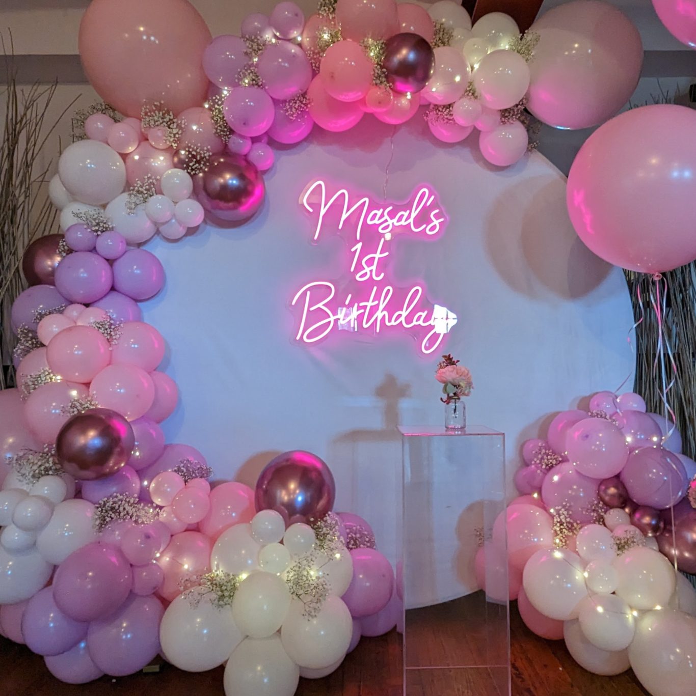 Ein super schöner Auftrag in Moers - Marsal´s 1ter Geburtstag. Ein sehr üppiger Rundbogen mit weißem Hintergrund, LED-Lichterkette und viel weißem Schleierkraut. Den LED-Schriftzug hatte mir die Kundin zur Verfügung gestellt.