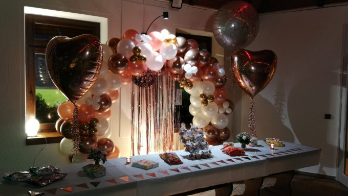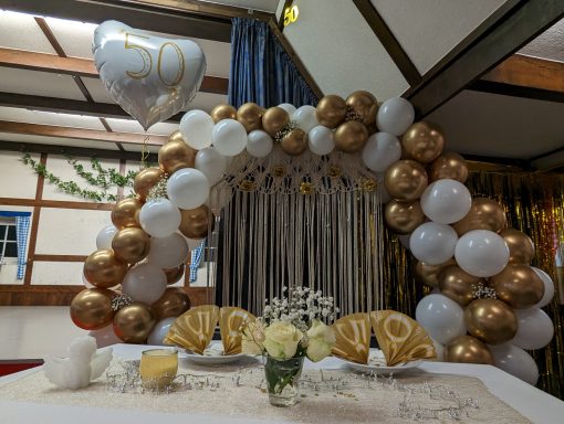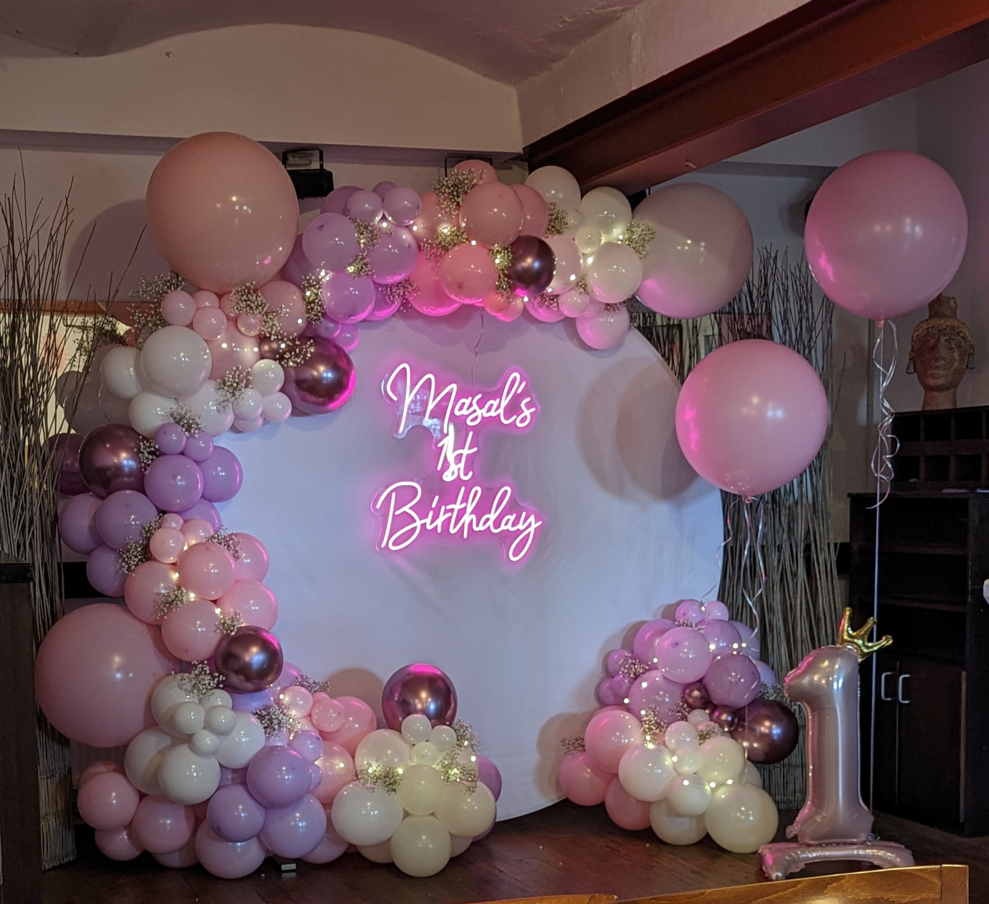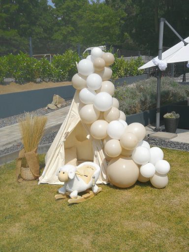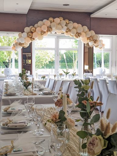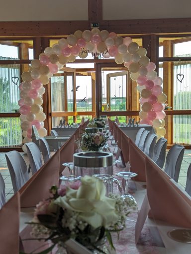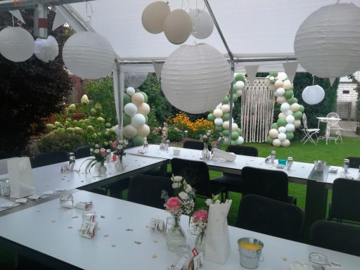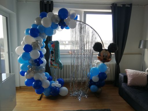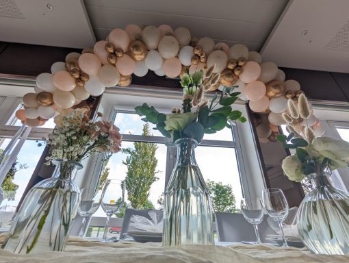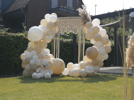 Ein super schöner Auftrag in Moers - Marsal´s 1ter Geburtstag. Ein sehr üppiger Rundbogen mit weißem Hintergrund, LED-Lichterkette und viel weißem Schleierkraut. Den LED-Schriftzug hatte mir die Kundin zur Verfügung gestellt.